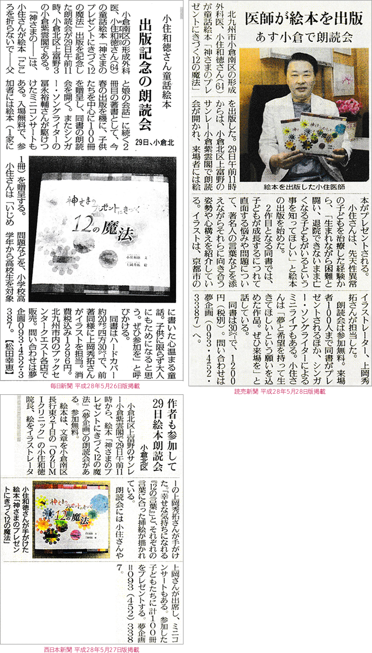 新聞各紙で「神さまのプレゼントにきづく12の魔法」朗読会が紹介されました。